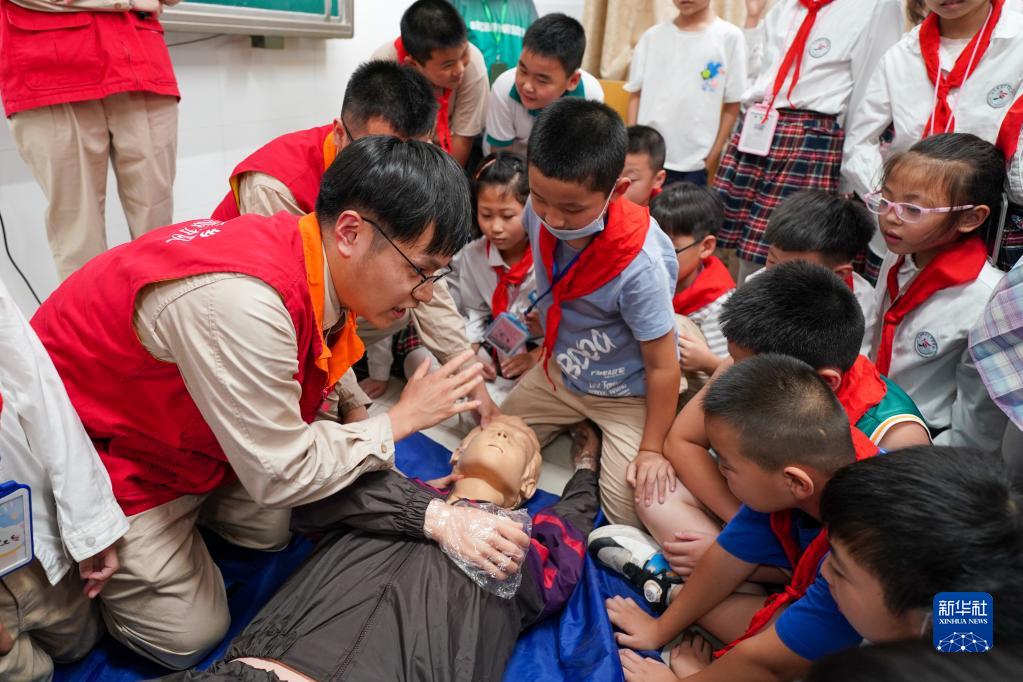 9月1日,江蘇省揚州市寶應縣供電公司的志愿者為寶應縣安宜實驗學校的學生講解觸電急救知識。