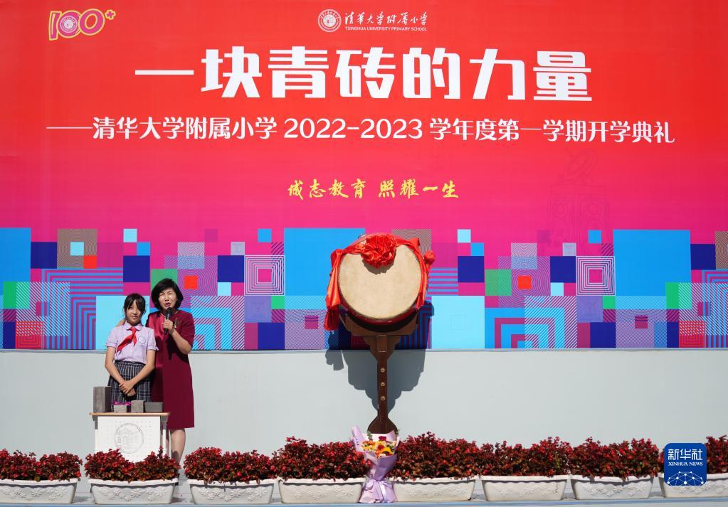 9月1日,在清華大學附屬小學開學典禮上,校長竇桂梅(右)在給同學們上開學第一課。