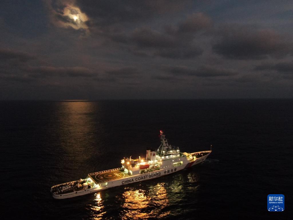 夜幕下在北太平洋公海執行巡航任務的長山艦(8月9日攝,無人機照片)。