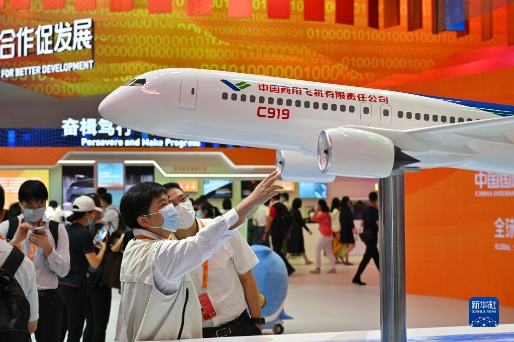 9月1日,觀眾在國家會議中心的中國服務貿易成就展專區內參觀C919飛機模型。