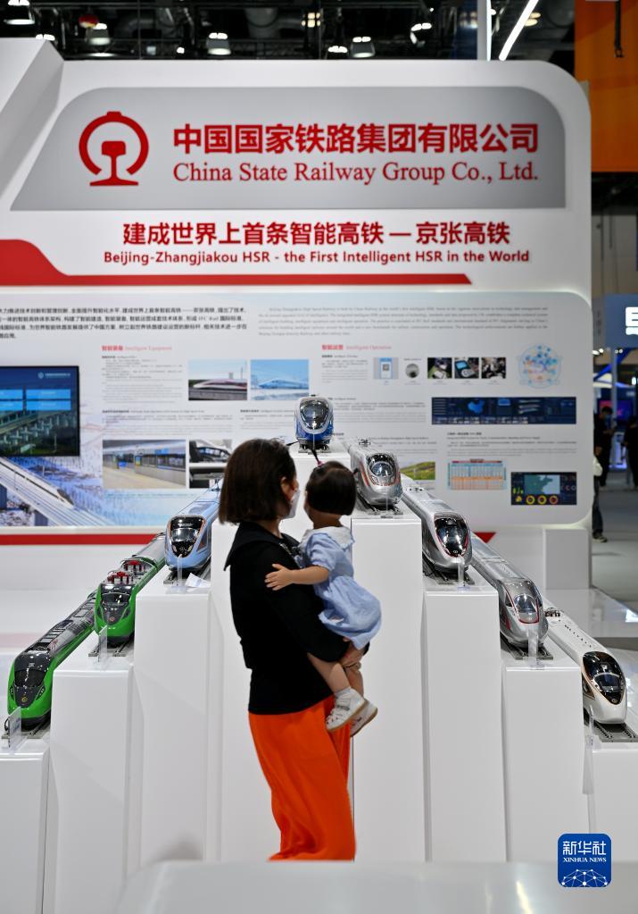 9月1日,觀眾在國家會議中心內的國鐵集團展臺觀看智能動車組模型。