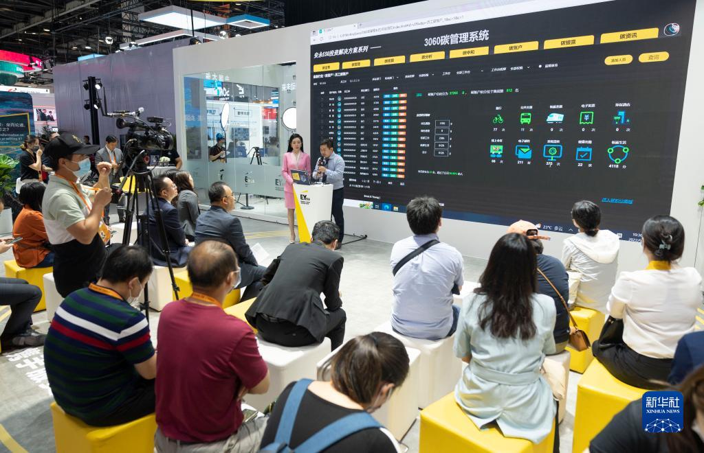 9月1日,在國家會議中心安永展臺,觀眾聽工作人員介紹3060碳管理系統。