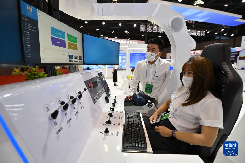 9月1日,參展商在博覽會現場介紹掘進機仿真培訓實操體驗一體機。