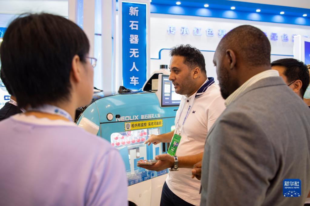 9月1日,一名參展商在博覽會上向其他展位的工作人員了解一款無人車產品。