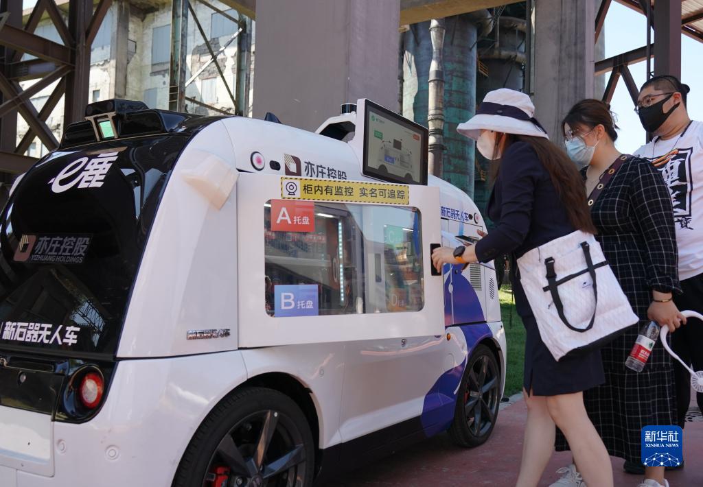 9月1日,在服貿會首鋼園展區,觀眾在體驗無人零售車購物。新華社記者 張晨霖 攝