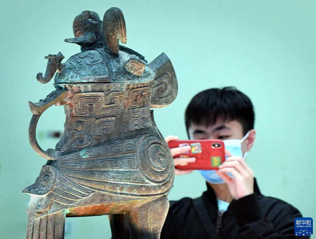 9月1日,參觀者在“博博會”上拍攝“婦好鸮尊”復制品。