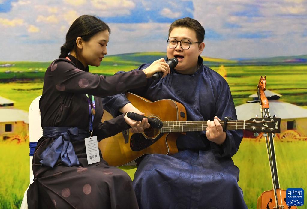 9月1日,工作人員在“博博會”斯琴塔娜藝術博物館展區表演。