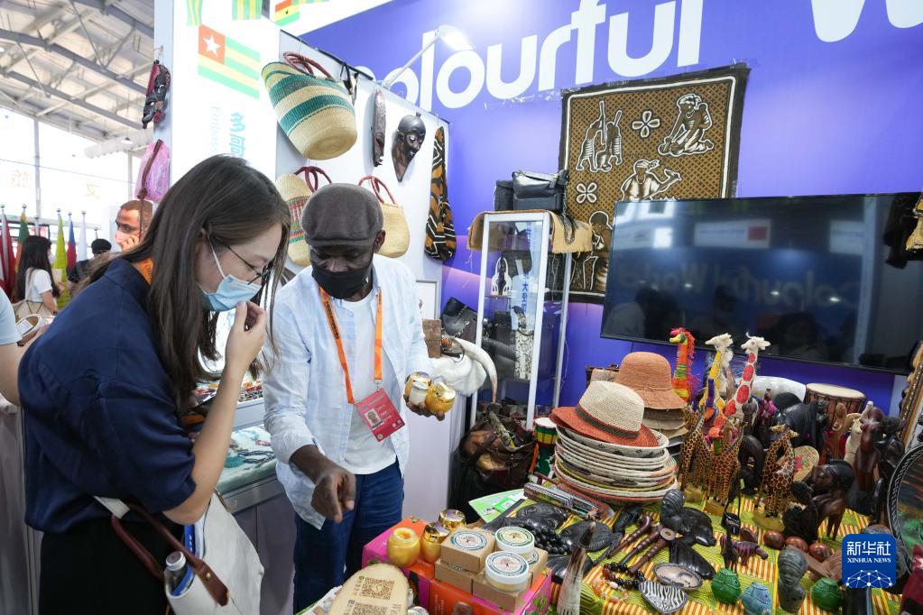 9月1日,在2022年服貿會首鋼園區,參觀者(左)在了解展出的多哥共和國商品。