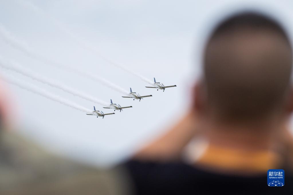9月1日,在湖南株洲蘆淞機場,觀眾觀看固定翼編隊飛行表演。