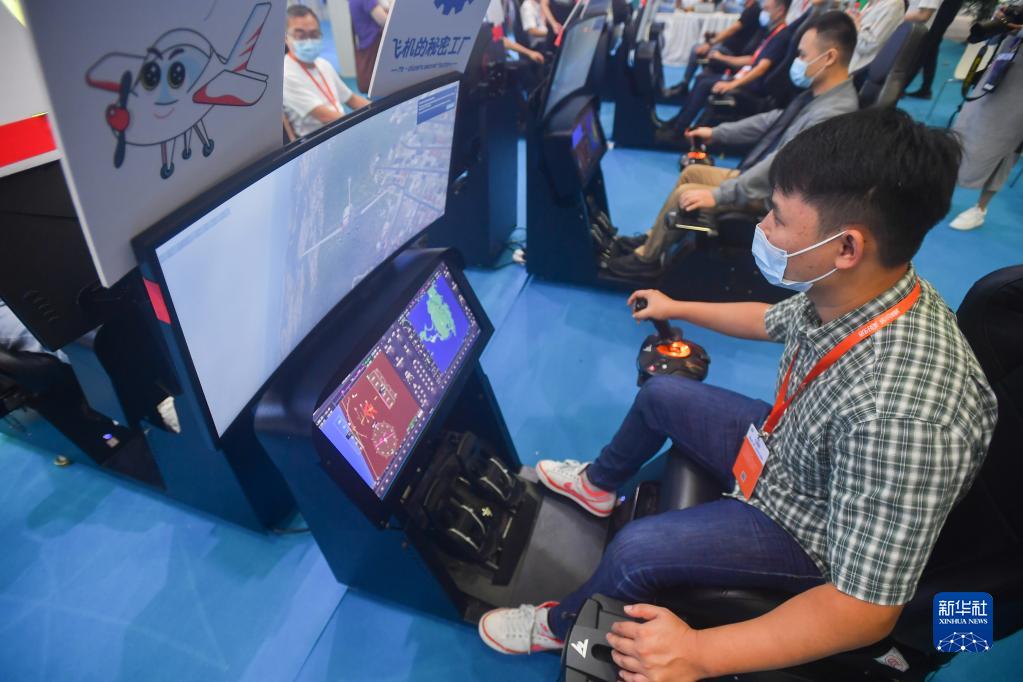 9月1日,在湖南長沙國際會展中心,參觀者在山河航空展位體驗飛行模擬器。