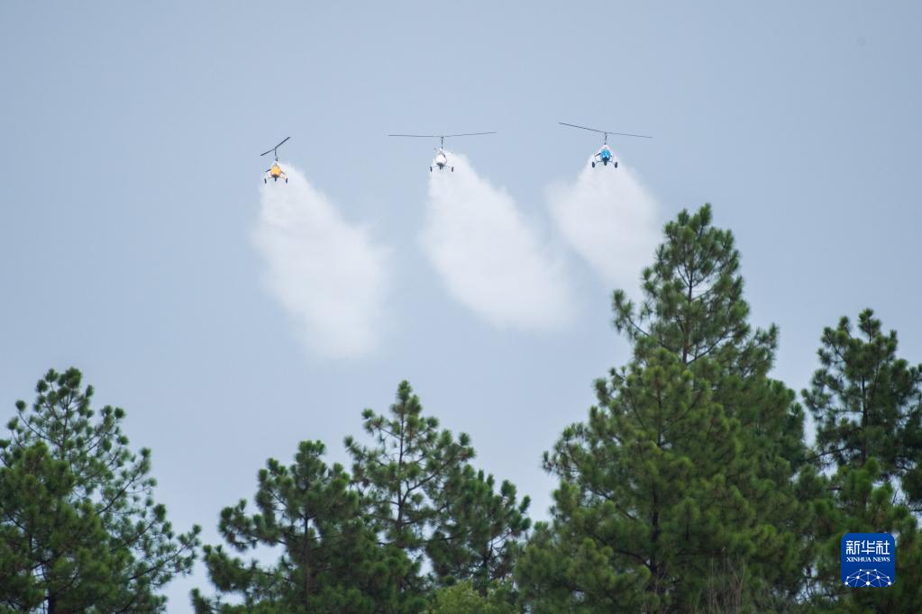 9月1日,在湖南株洲蘆淞機場,飛行員進行旋翼機編隊飛行表演。
