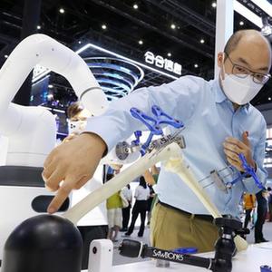 9月1日,工作人員(左一)向參觀者介紹微創骨科手術機器人。當日,2022世界人工智能大會在上海世博中心拉開帷幕。今年大會的主題是“智聯世界 元生無界”。新華社記者 方喆 攝