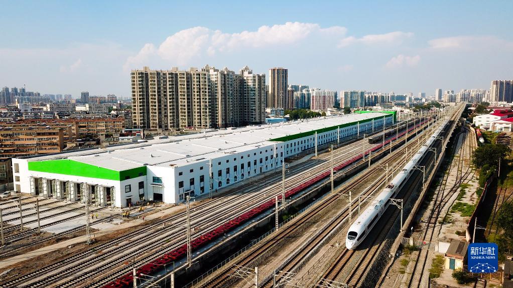 9月1日,一列高鐵駛過濟(南)鄭(州)高鐵濟南站動客車整備所(無人機照片)。新華社記者 郭緒雷 攝