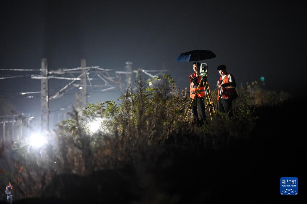 9月1日凌晨,施工人員在重慶鐵路樞紐東環線磨心坡站作業。新華社記者 王全超 攝