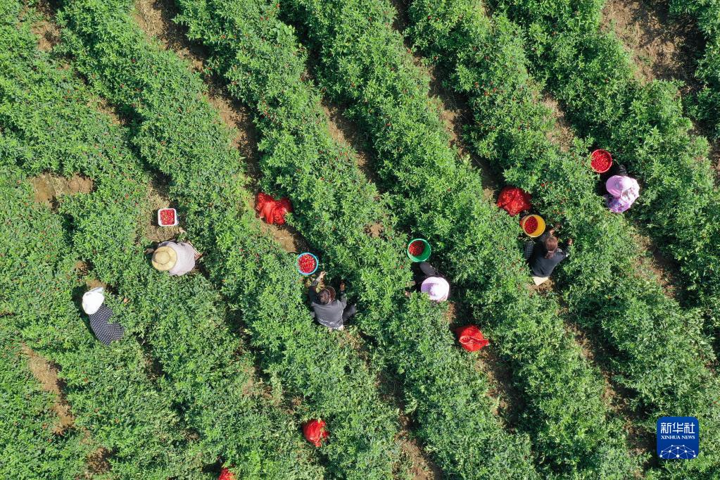 9月1日,河南省寶豐縣石橋鎮竹園村農民在田間收獲草莓椒(無人機照片)。