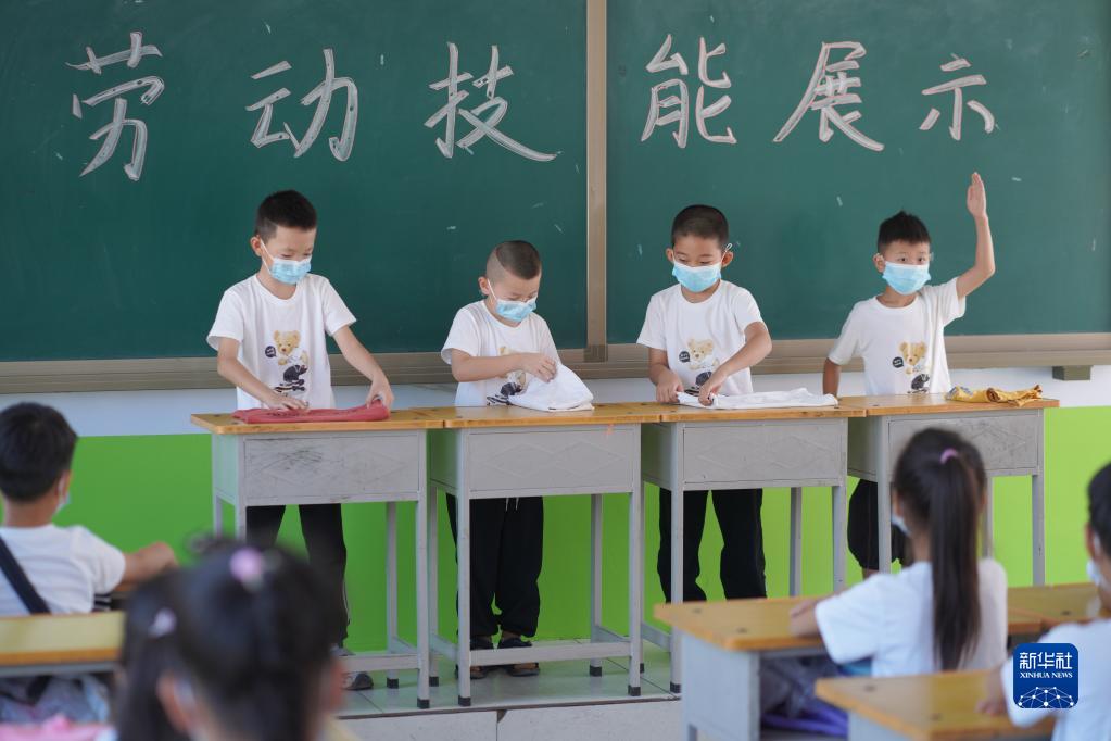 9月1日,河北省邢臺市內丘縣西陽小學學生在開學第一課上比拼勞動技能。