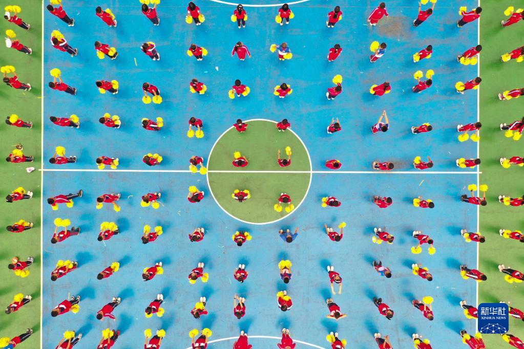 9月1日,貴州省貴陽市開陽縣第一小學學生在跳自編舞《天天向上》(無人機照片)。