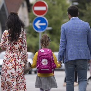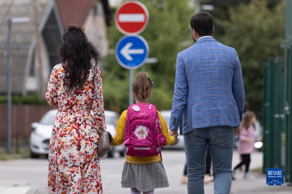 9月1日,斯洛文尼亞盧布爾雅那維克小學一年級學生在父母的陪同下走向學校。