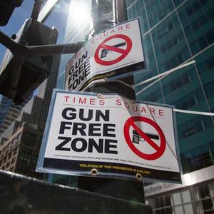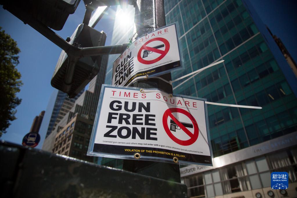 這是9月1日在美國紐約時報廣場鄰近街區拍攝的“禁槍區”標志牌。