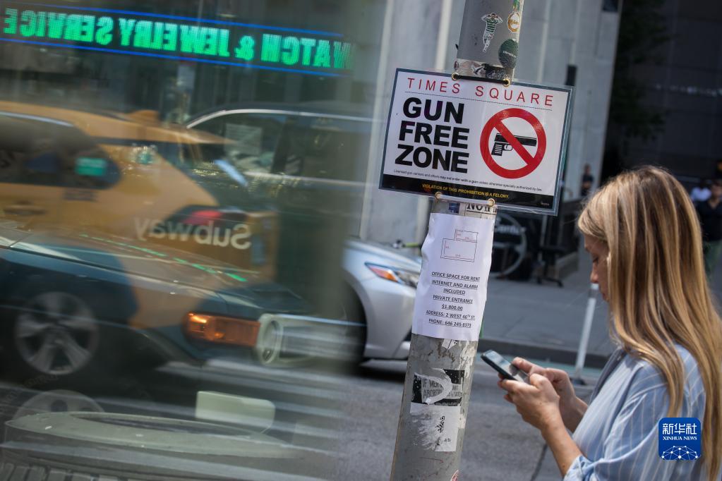 9月1日,人們從美國紐約時報廣場鄰近街區的“禁槍區”標志牌旁走過。