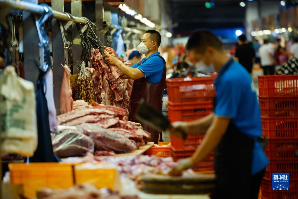 9月2日清晨,成都農產品中心批發市場商戶在準備肉類產品。