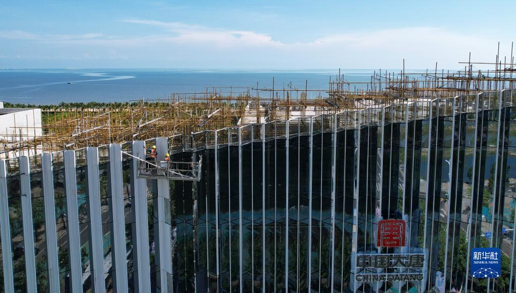 9月1日,工人在??诮瓥|新區的大唐國際貿易中心項目施工作業(無人機照片)。
