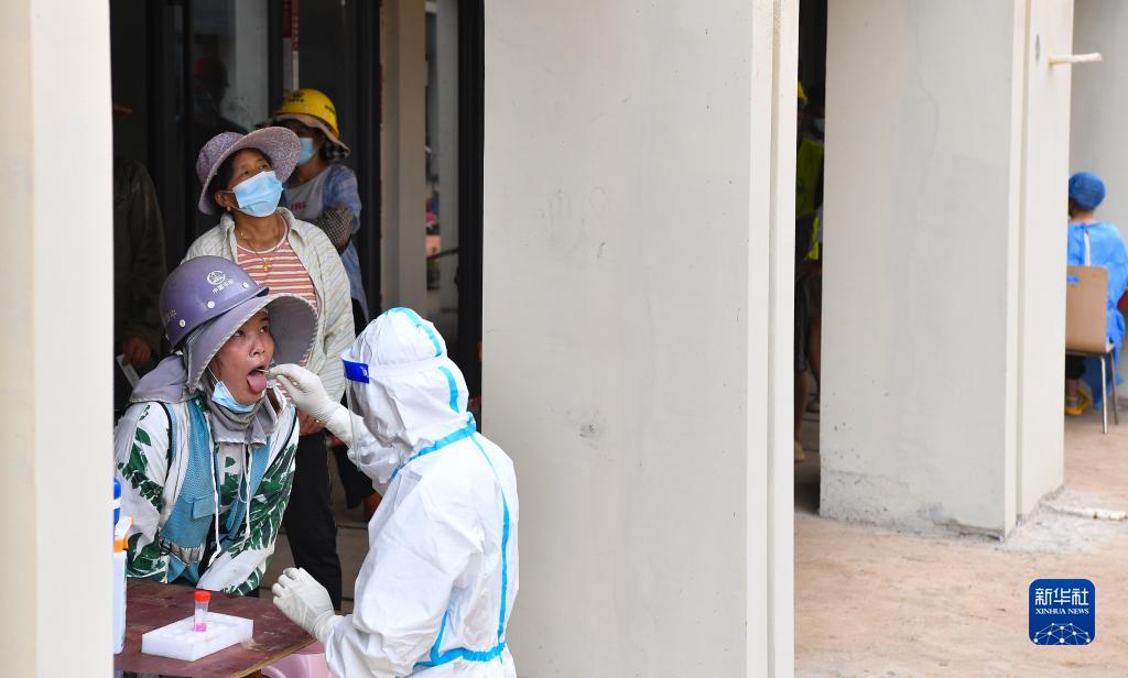 9月2日,在??诮瓥|新區東寨新居一期項目,工人排隊進行核酸采樣。