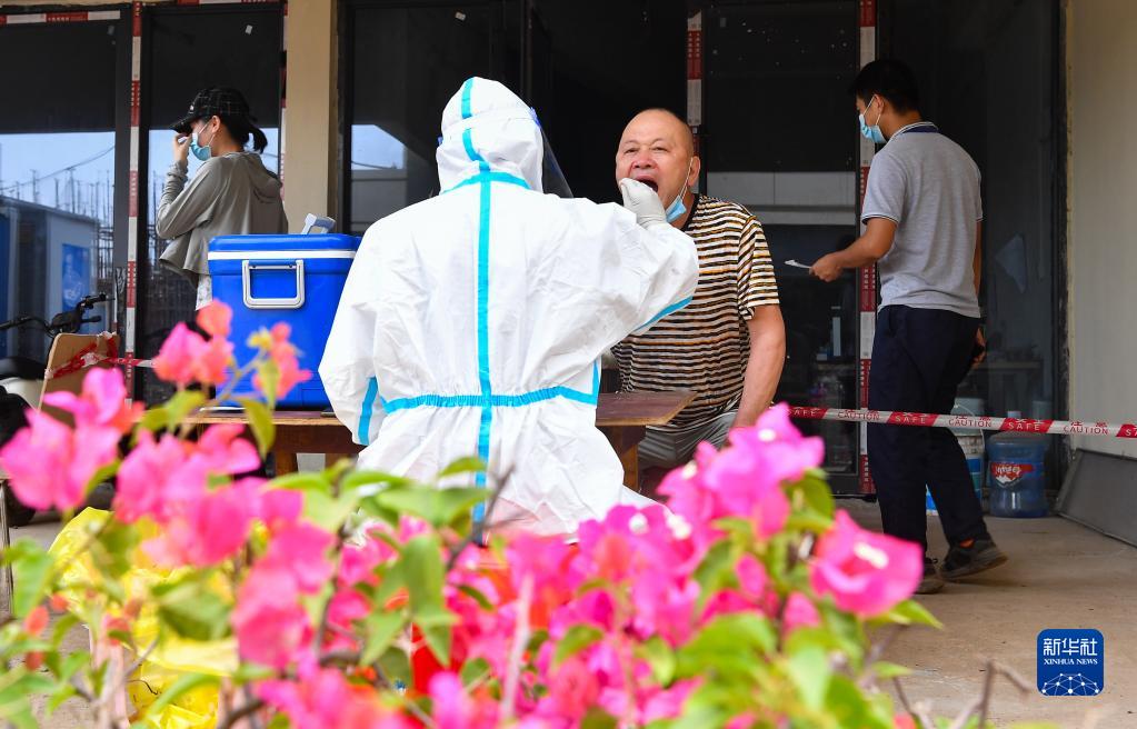 9月2日,在??诮瓥|新區東寨新居一期項目,工人排隊進行核酸采樣。