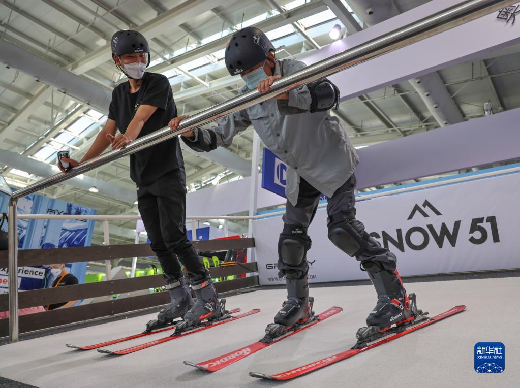 9月1日,一名男子在體育服務專題展區體驗滑雪模擬設備。