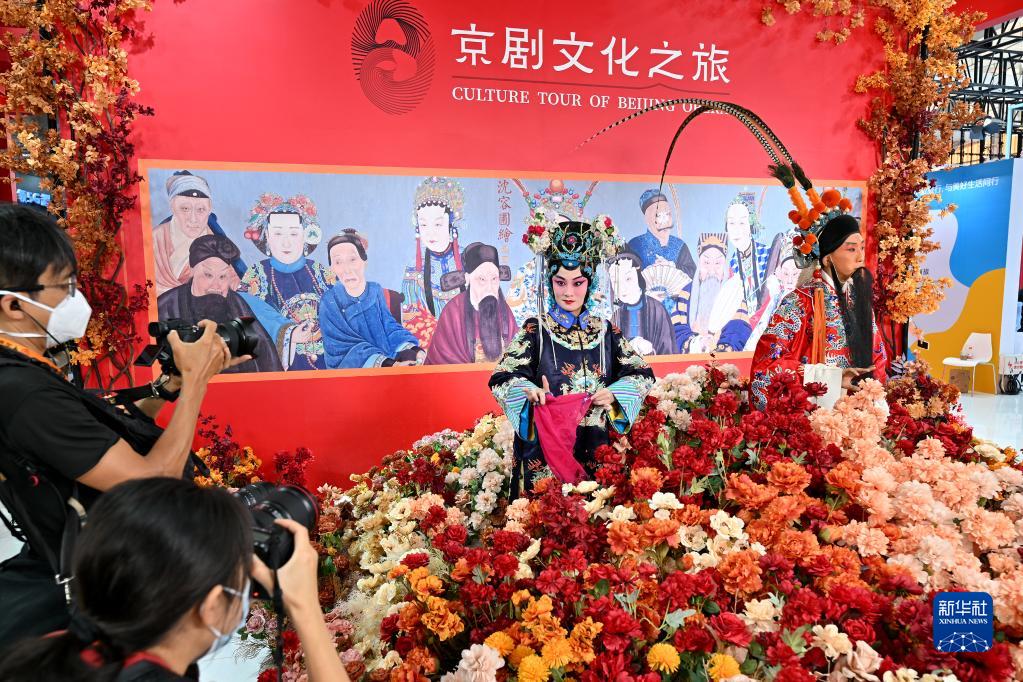 9月2日,在文旅服務專題展區,觀眾在北京文旅展臺拍攝京劇表演展示。
