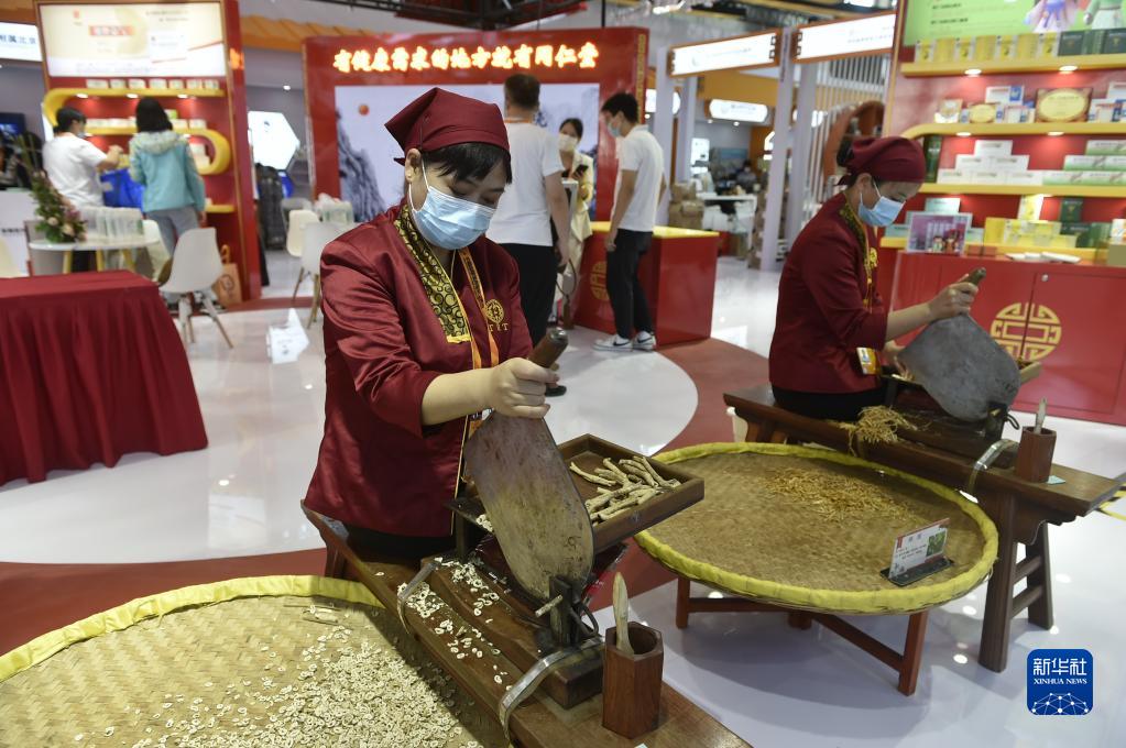 9月1日,在健康衛生服務專題展區,工作人員在展示中藥材加工技藝。