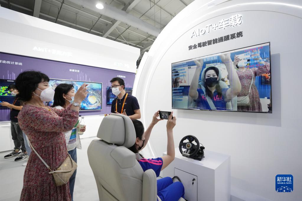 9月1日,在電信、計算機和信息服務專題展區,參觀者在體驗一款安全駕駛智能提醒系統。