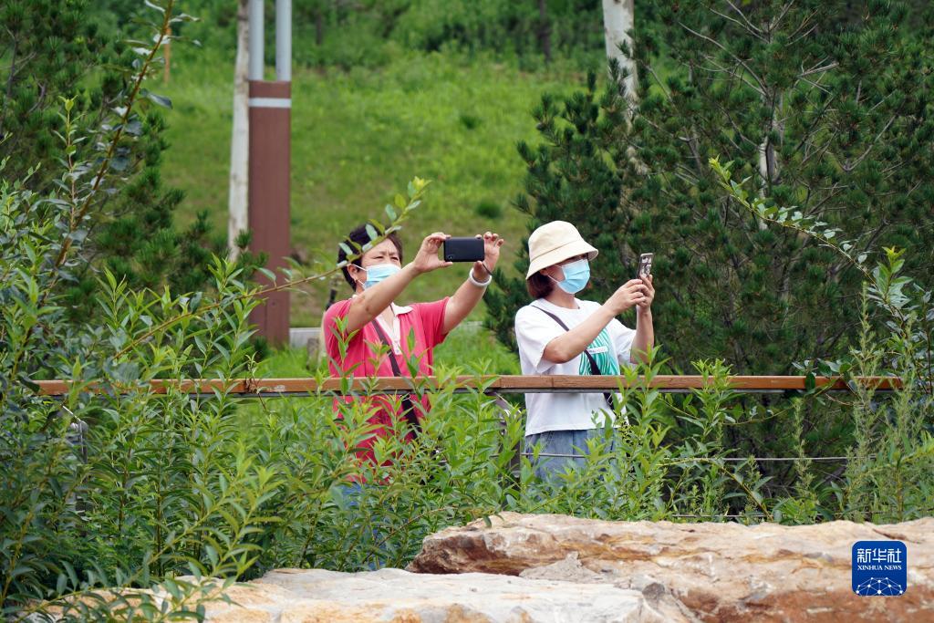 2022年7月19日,居民在河北邯鄲武安市九龍山礦山生態修復公園拍照游玩。