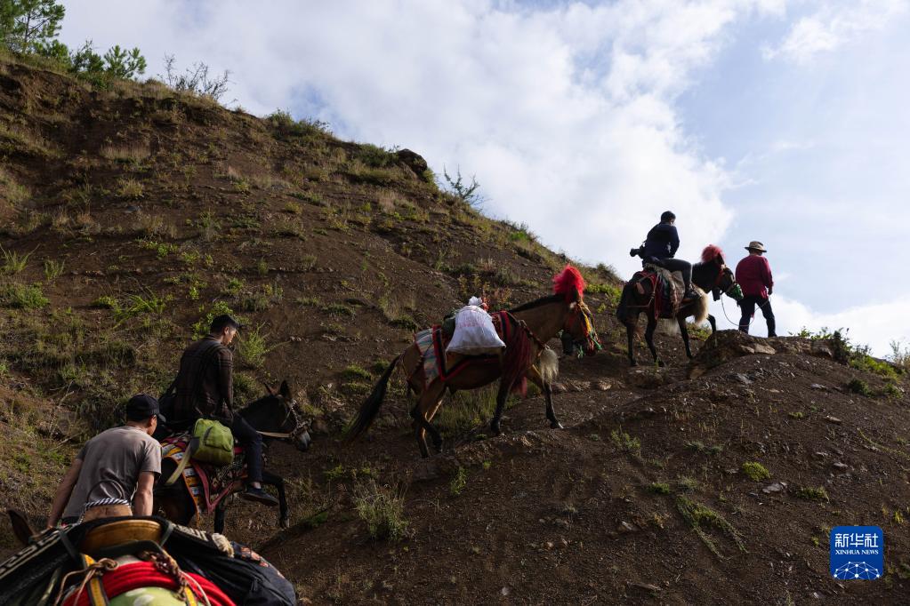 瀘沽湖馬幫帶著游客前往牛窩子山山頂(9月1日攝)。