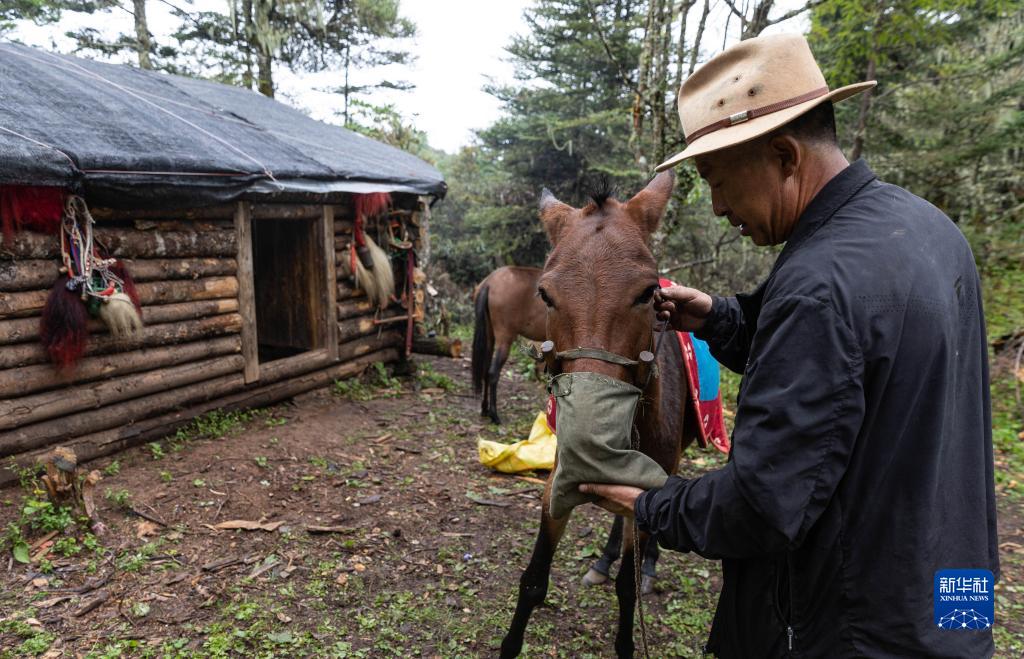 瀘沽湖馬幫隊隊長楊直之在營地為給牲口喂口糧,為下山做準備(9月2日攝)。