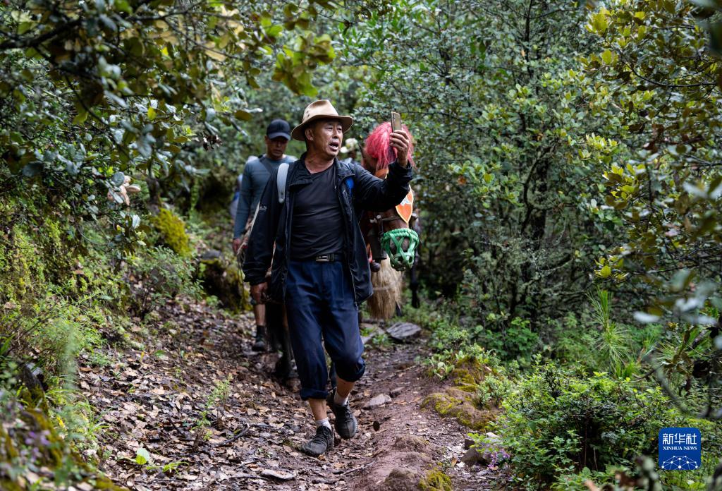 瀘沽湖馬幫隊隊長楊直之一邊牽著馬一邊唱著山歌錄視頻(9月1日攝)。