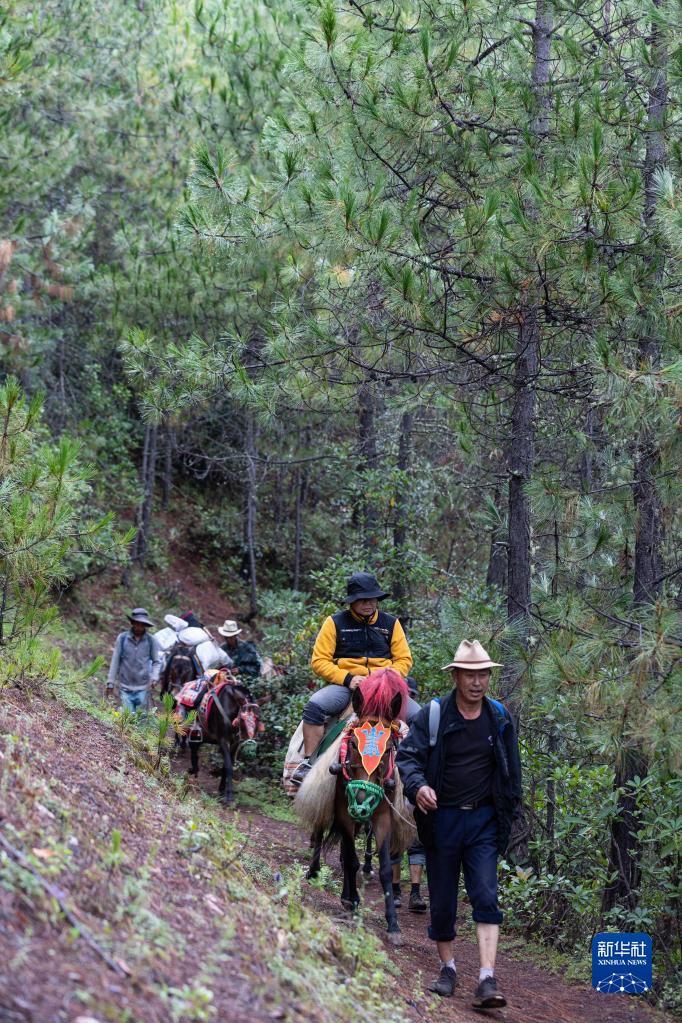游客騎著瀘沽湖馬幫隊騾子下山(9月2日攝)。