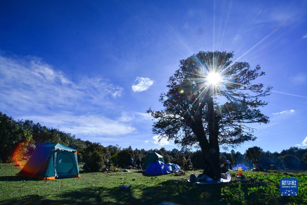 在牛窩子山山頂,游客在露營(9月1日攝)。