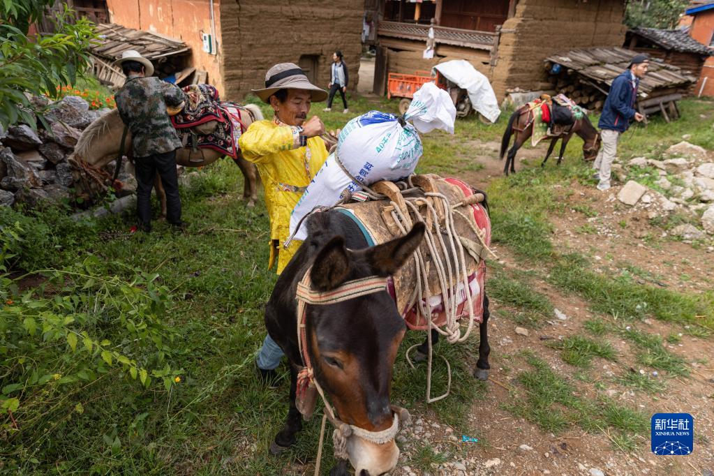 在鹽源縣瀘沽湖鎮木垮村,瀘沽湖馬幫隊隊員打包行李準備出發上山(9月1日攝)。