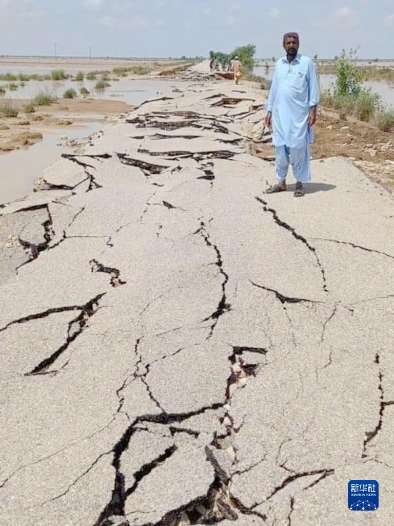 這是8月28日在巴基斯坦俾路支省賈法拉巴德地區拍攝的被洪水損毀的公路。