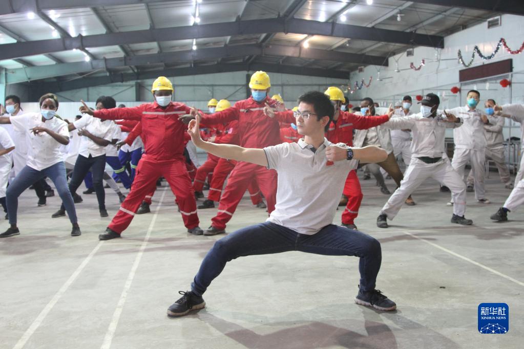 8月26日,在津巴布韋旺吉電站,醫療隊隊員帶領中企員工和當地居民學習中國傳統健身體操八段錦。