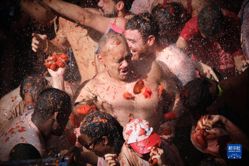 8月31日,在西班牙布尼奧爾舉行的“西紅柿節”上,人們參加“西紅柿大戰”。