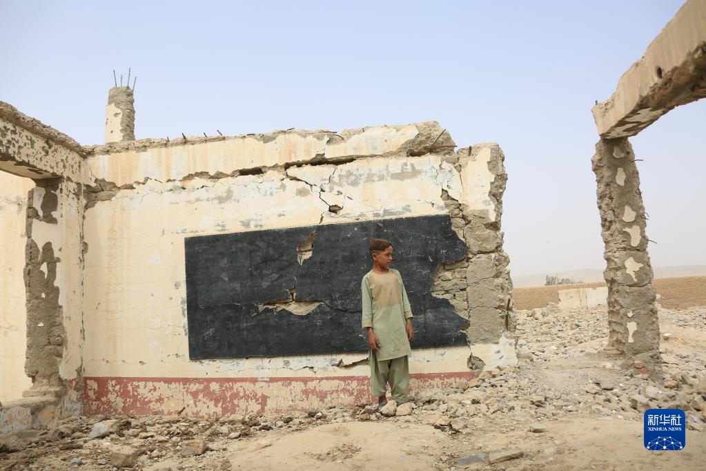 8月23日,在阿富汗南部赫爾曼德省桑金地區,一名男孩站在廢墟之中。