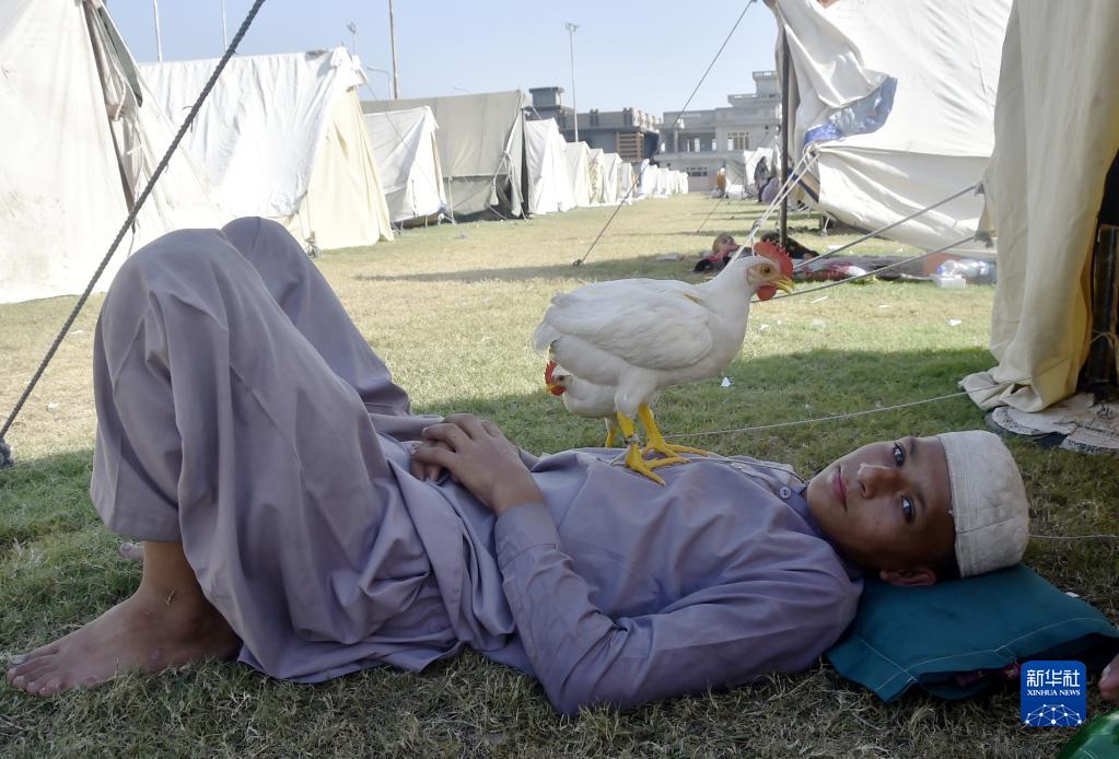 8月31日,在巴基斯坦西北部開伯爾-普什圖省的賈爾瑟達地區,一名小男孩在救災帳篷外休息。