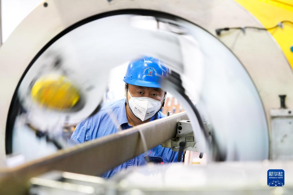 9月3日,在哈電集團哈爾濱電機廠有限責任公司的生產車間,工人在進行生產作業。