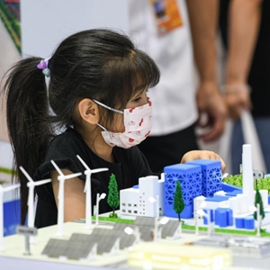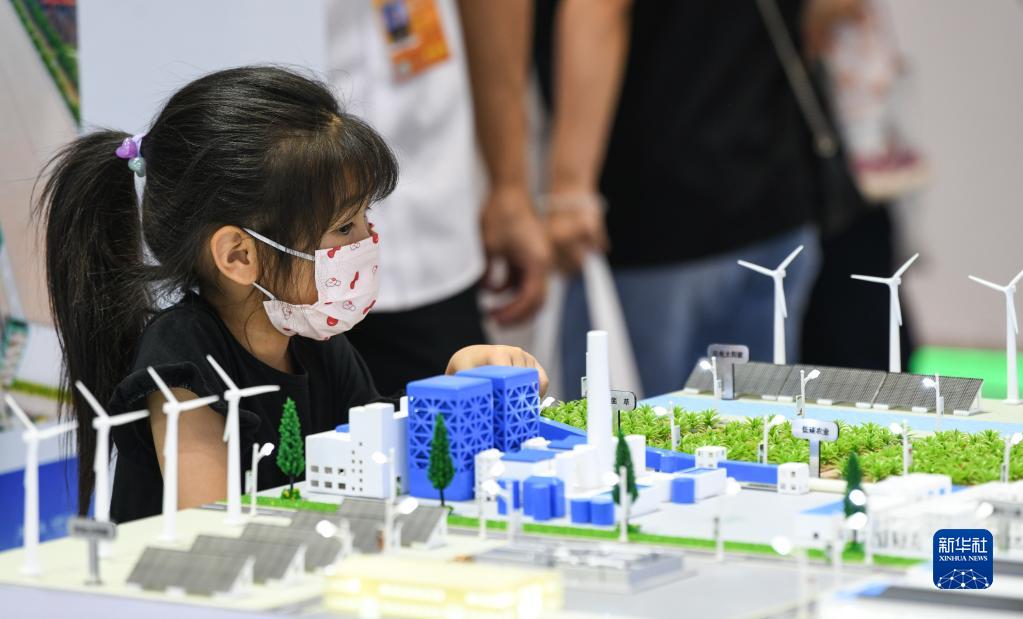 9月3日,在環境服務專題展區,一名小觀眾在參觀光電碳中和模型。