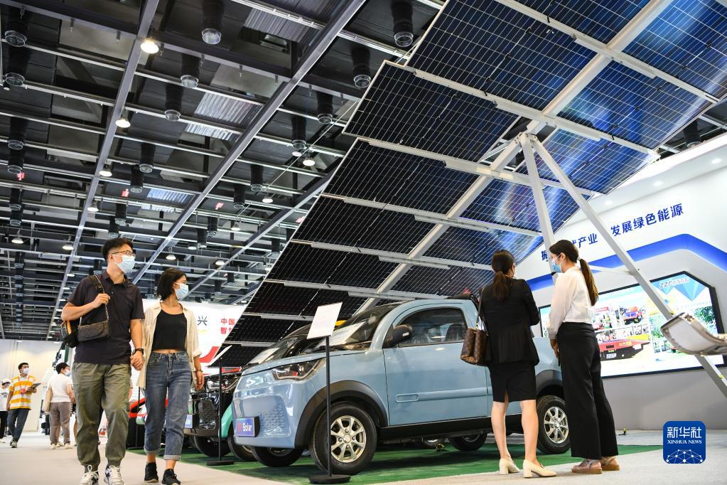 9月3日,在環境服務專題展區,觀眾參觀太陽能車。