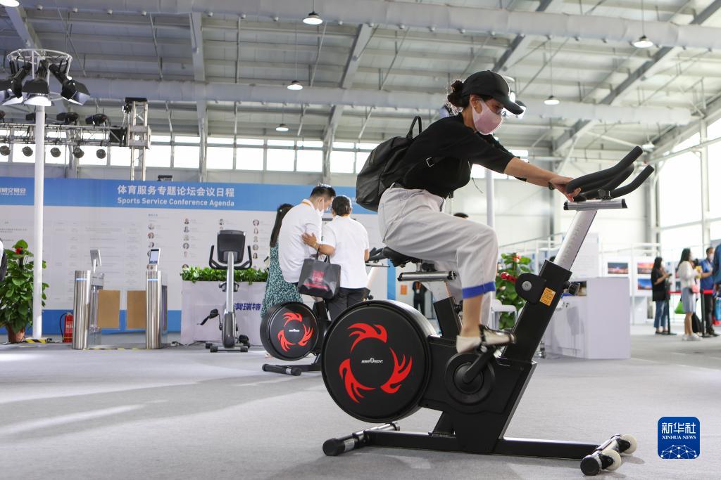 9月3日,觀眾在體育服務專題展區體驗健身器材。