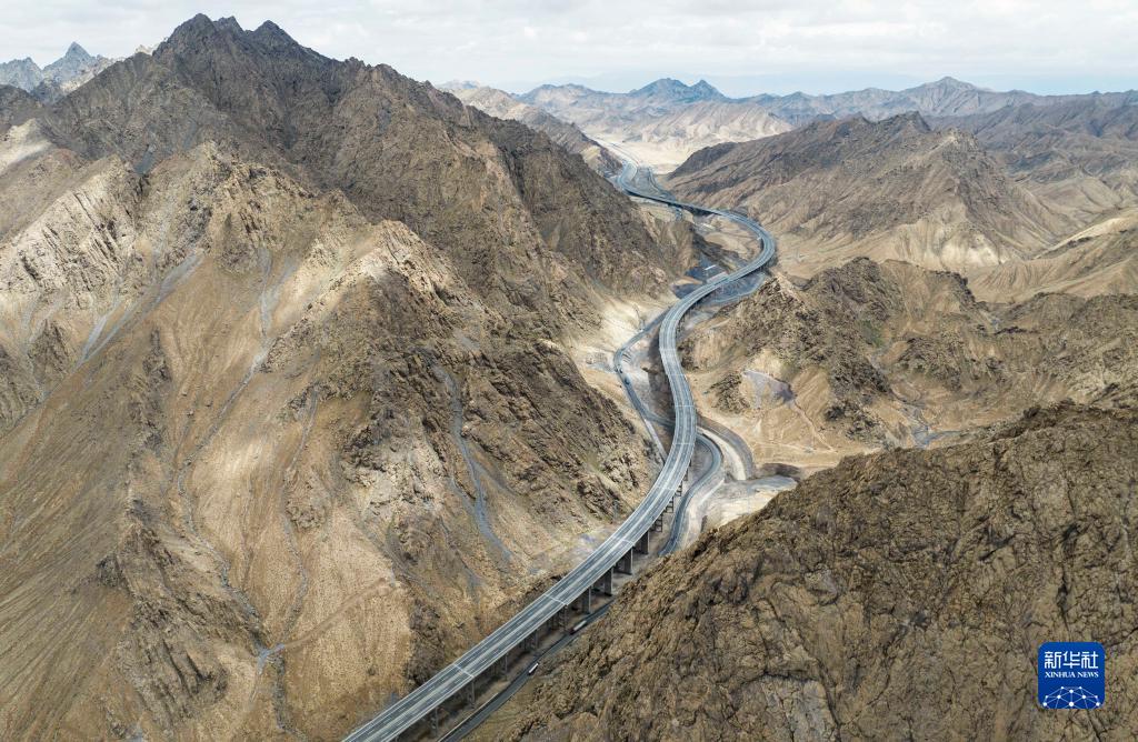 依若高速公路蜿蜒穿越新疆若羌縣山區(8月6日攝,無人機照片)。8月30日,依吞布拉克至若羌高速公路(簡稱依若高速)建成通車,成為繼G7和G30之后進出新疆的第三條高速公路。