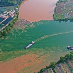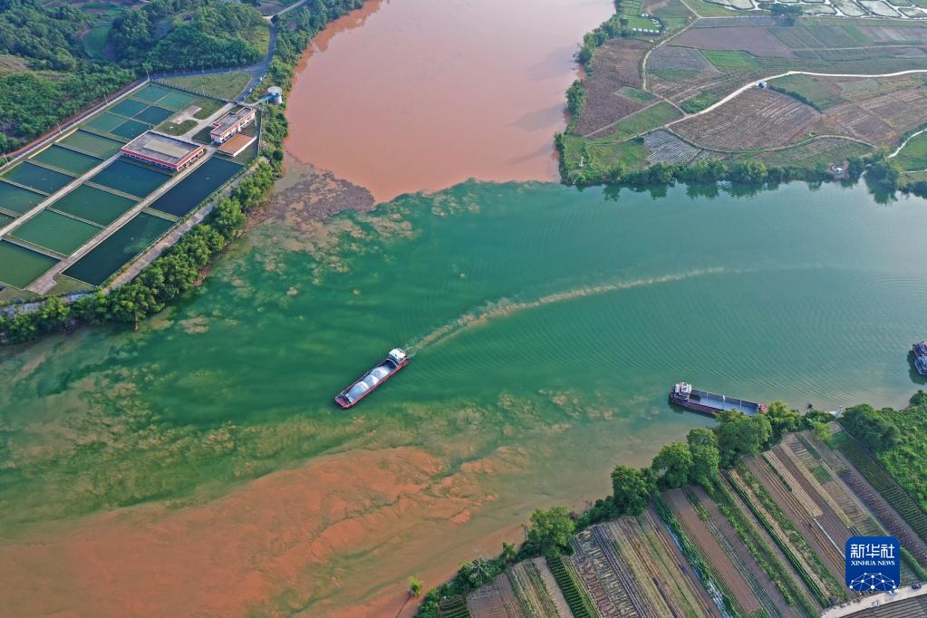 三江口地處廣西南寧市江南區江西鎮,左江與右江在這里匯合后成為邕江。受近日上游降雨影響,左江江水渾濁發黃,渾黃的左江水與清澈的右江水在三江口水域交匯。
